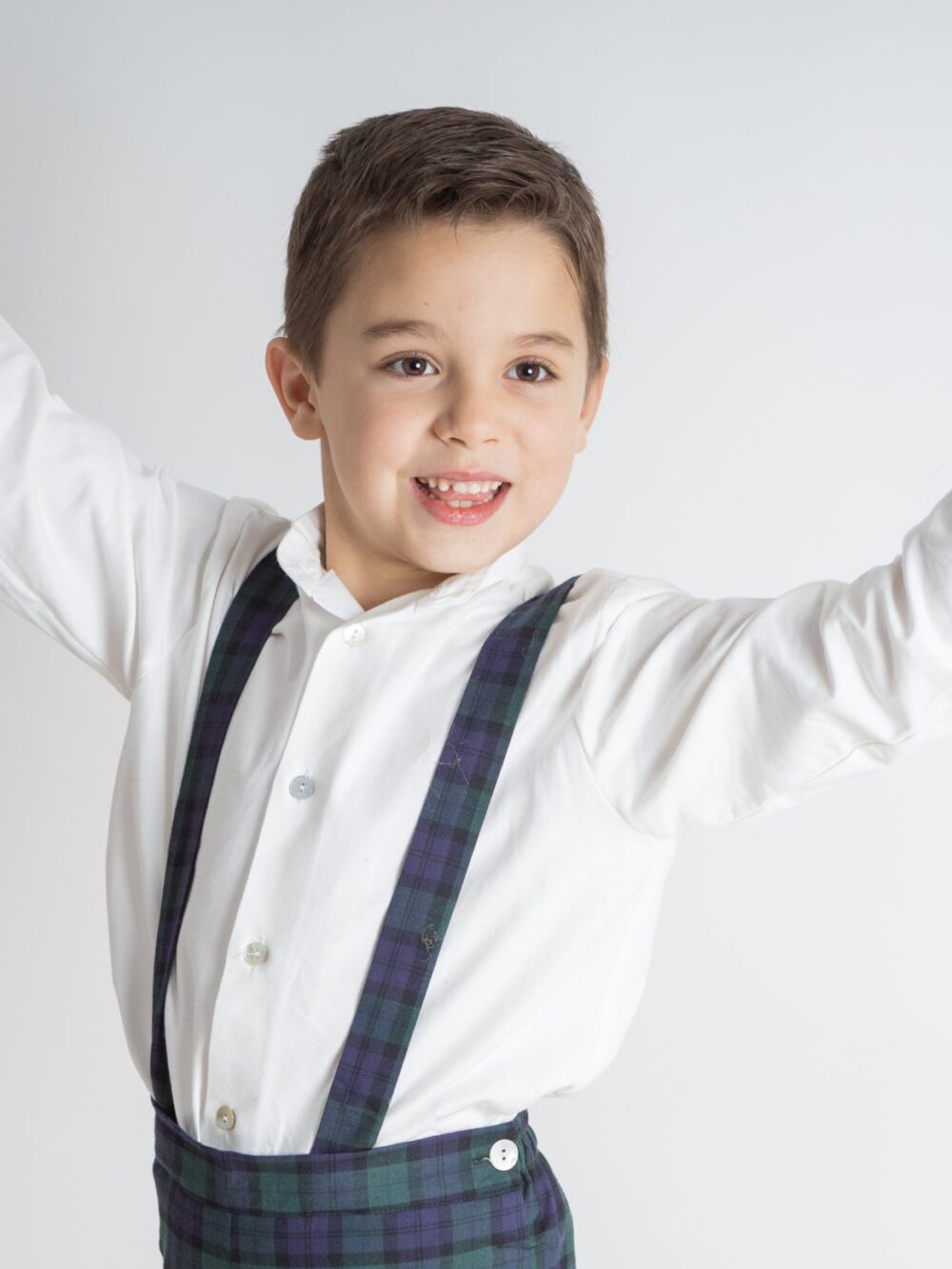 Pantalón corto colección Noel confeccionado en Viella de cuadros . Ajustable en la cintura con gomas de ojales. Ideal hasta los 6 años con este largo para tallas superiores, sugerimos tipo bermuda.