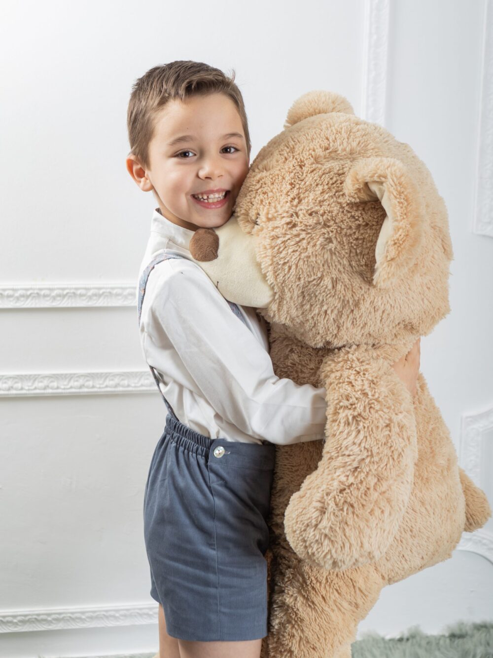 Pantalón corto colección Ramas confeccionado en micro pana gris con tirantes en flores a tono . Ajustable en la cintura con gomas de ojales. Ideal hasta los 6 años con este largo, para tallas superiores, sugerimos tipo bermuda.