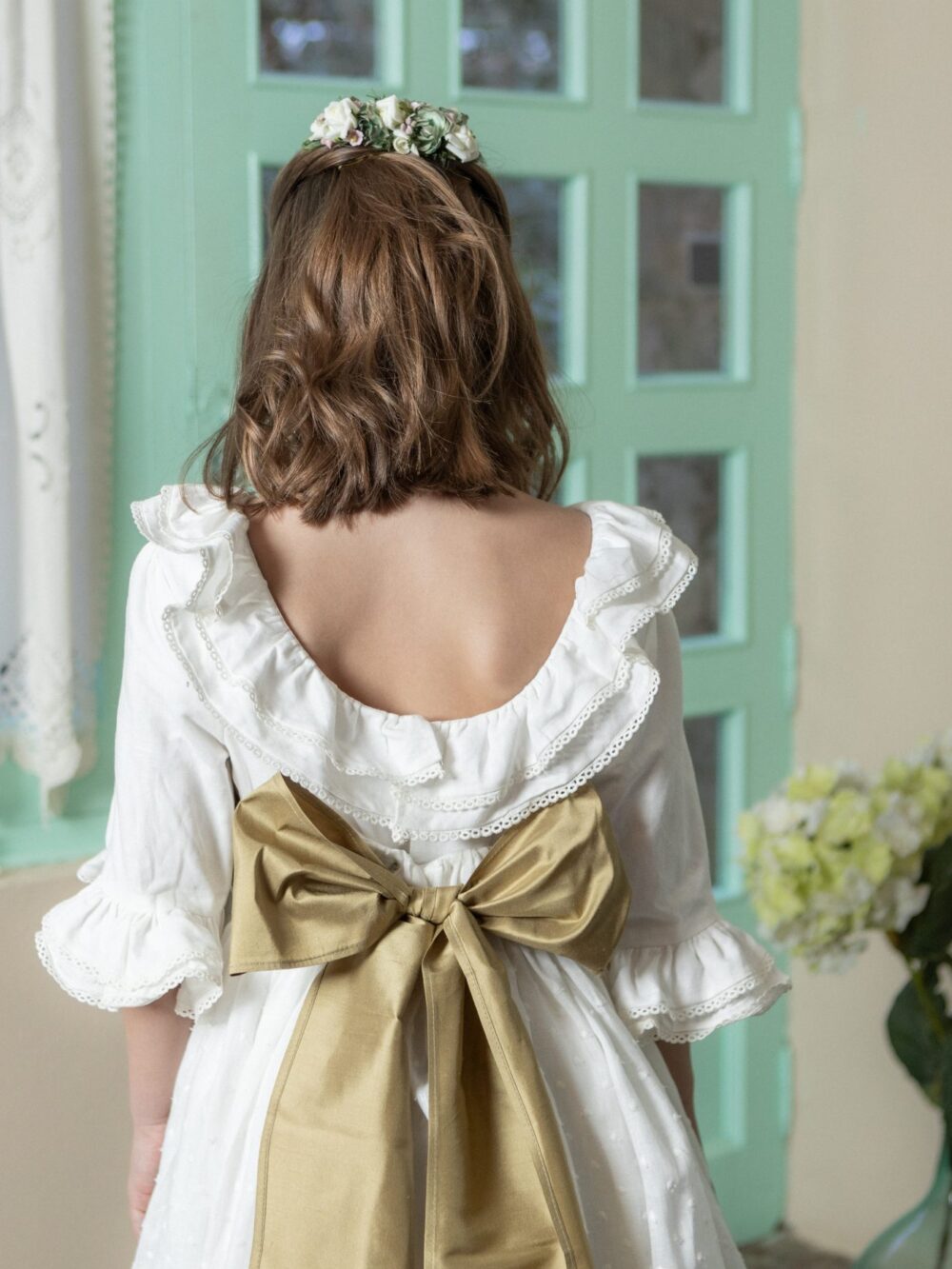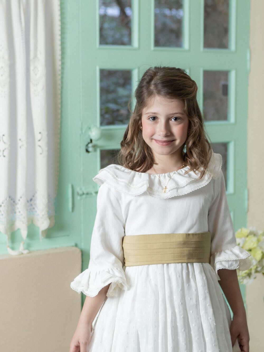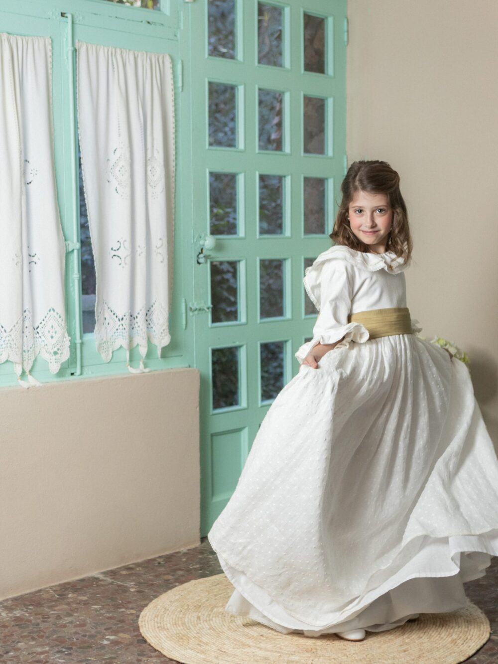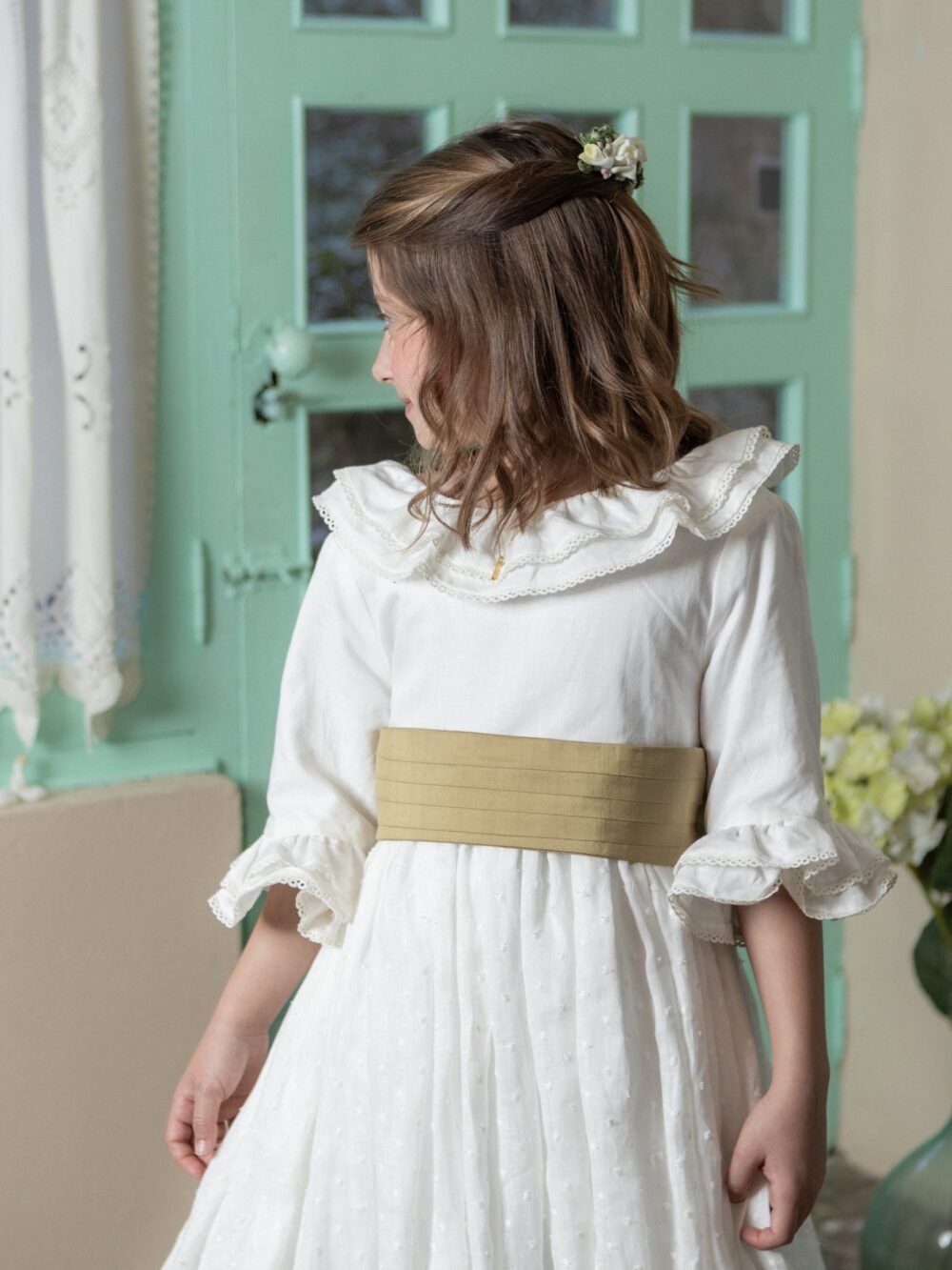 Falda plisada en cotton lino bordado en bodoques y rematado por la misma puntilla que en la manga y escote.