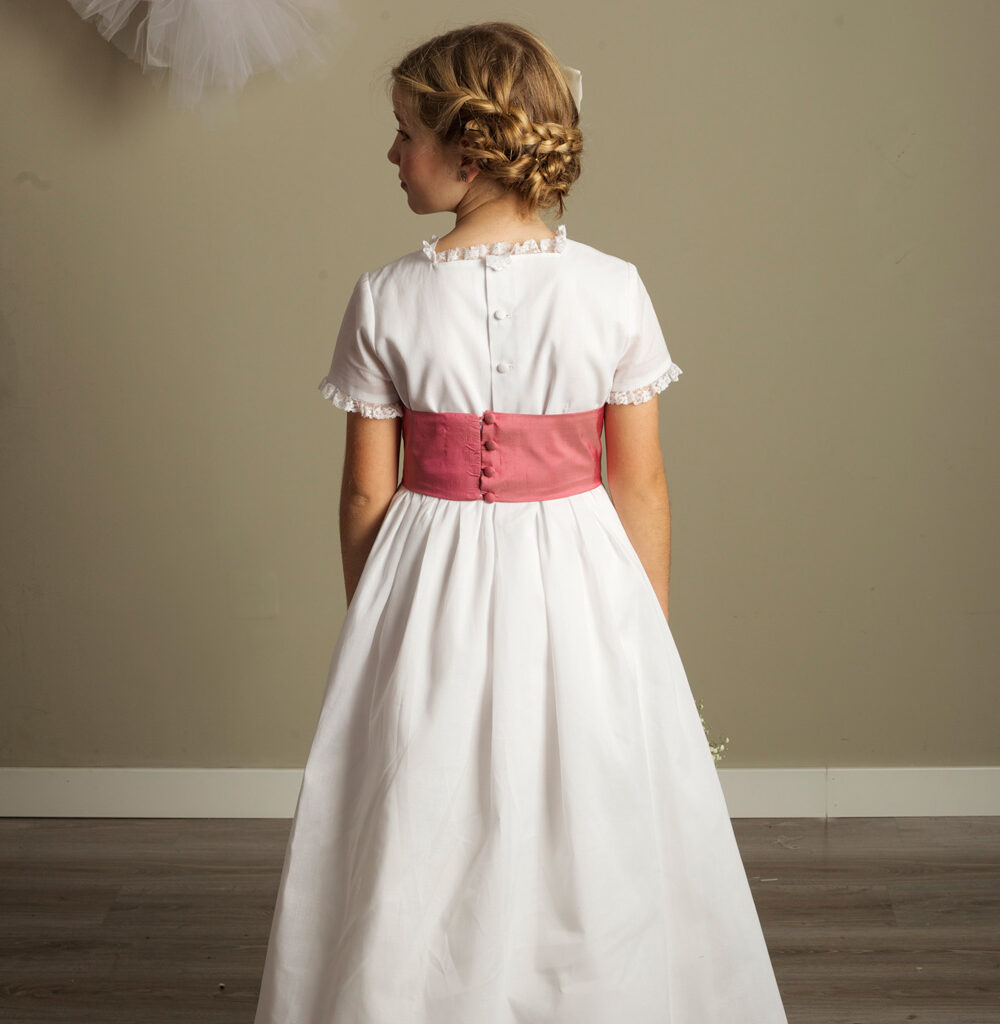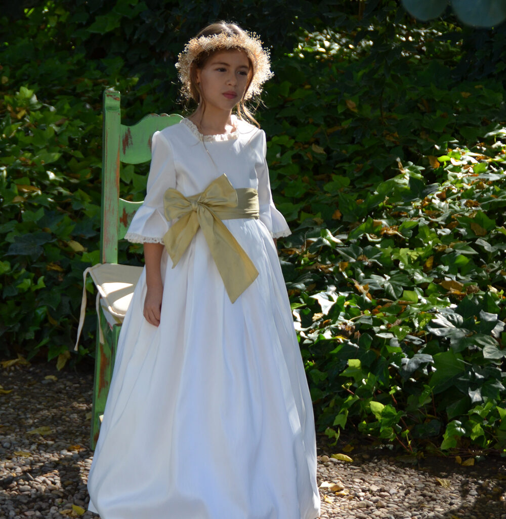 Vestido de Primera Comunión confeccionado en shantung blanco roto . Escote a la caja por delante y por detrás en forma de lagrima . Manga corta . Cuerpo entallado, corte a la cintura con detalle de tul bordado por delante y por detrás con banda en chiffon ecru. Falda con tabla central y dos laterales .Todos los botones van forrados.