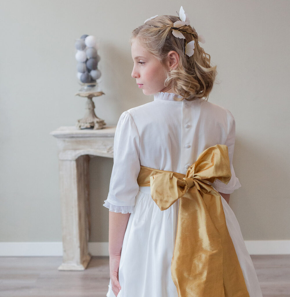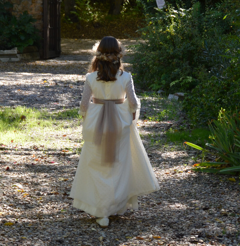 Vestido de Primera Comunión, confeccionado en tejido de otomán beige en el cuerpo, la falda en batista beige con sobrefalda de organza de seda beige. Escote cuadrado con adorno de volante de organza beige. Cuerpo entallado con corte en la cintura. Falda plisada. Manga francesa rematada con adorno de volante de organza beige como el del escote. Todos los botones van forrados.