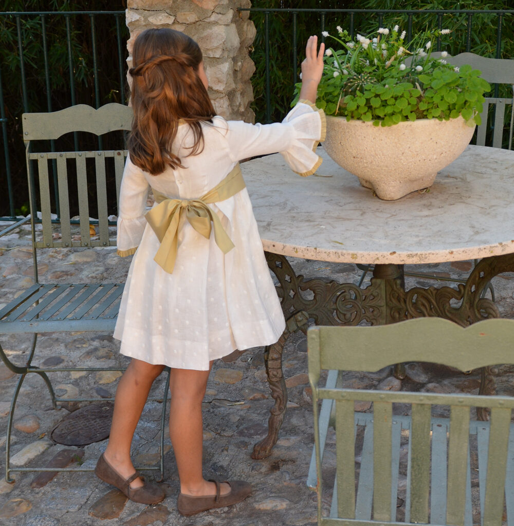 Vestido modelo Alba de lino blanco en la parte de arriba y lino rosa maquillaje en la parte de abajo con sobre falda de tul.