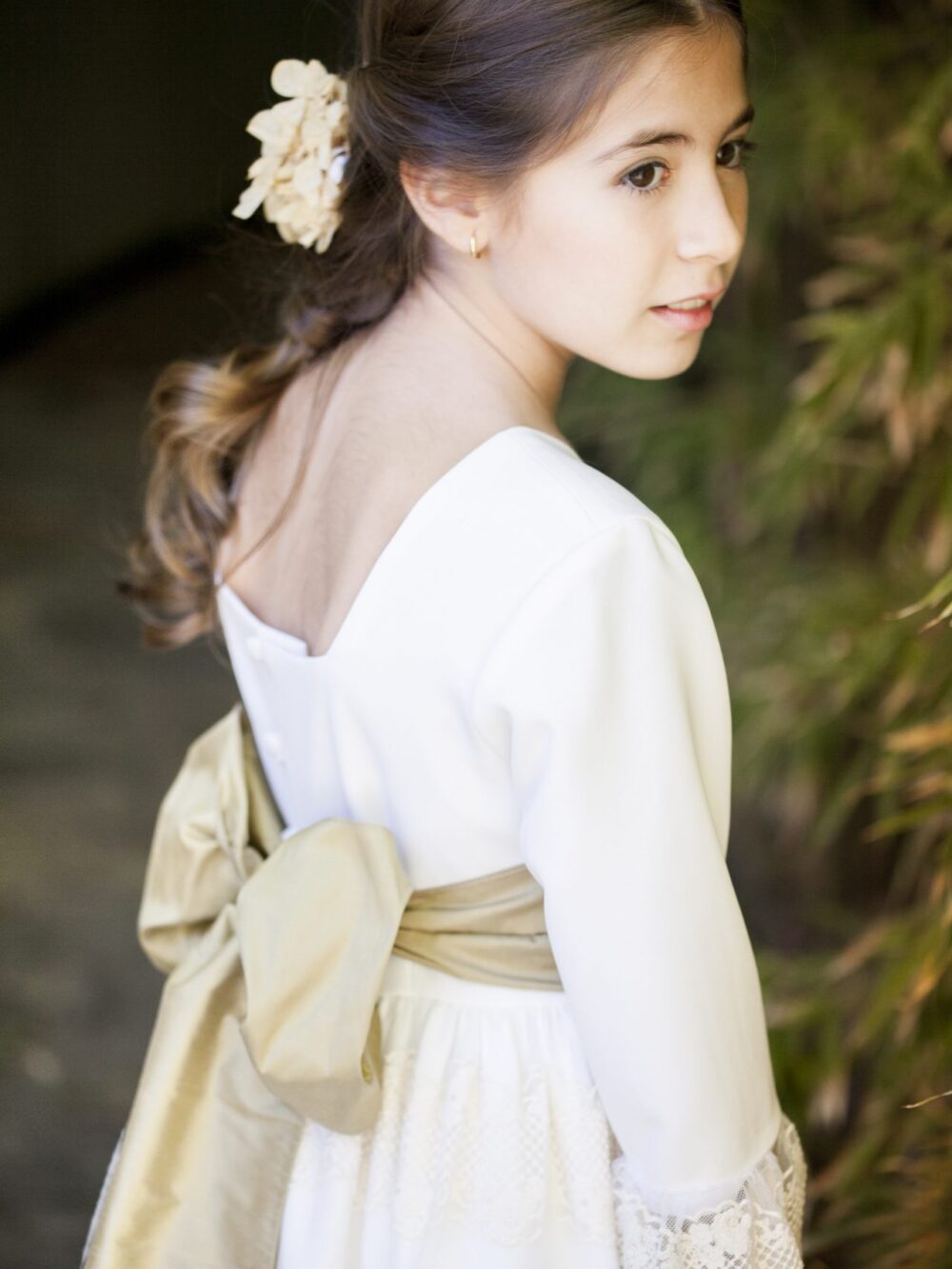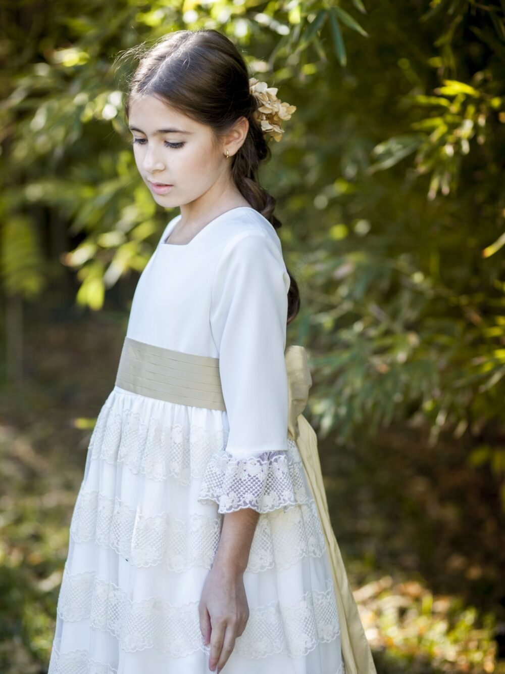 Vestido Primera Comunión confeccionado con tejido de crep beige y tul bordado en la sobrefalda. Escote a la cuadrado, por detrás más pronunciado.